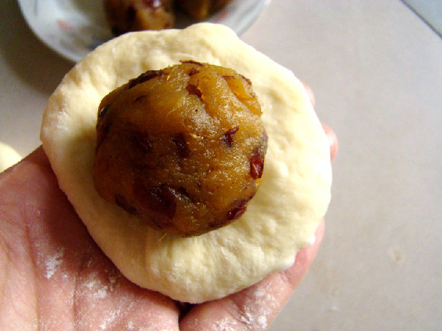 9,包住蔓越莓紅薯餡,粘緊收口。
