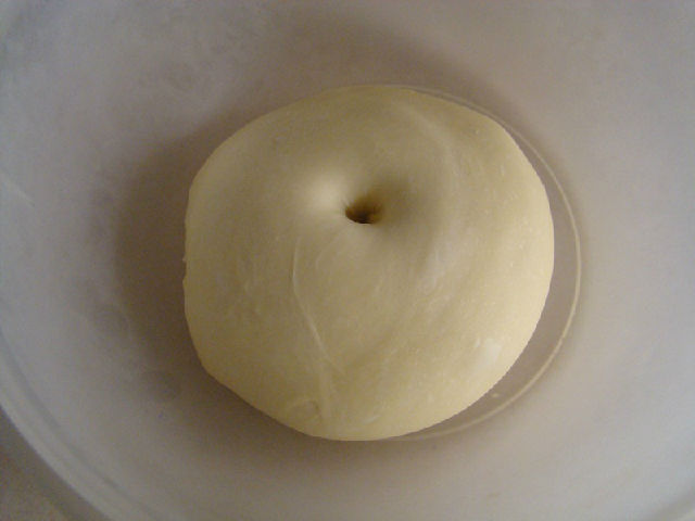 7,把面團(tuán)原料放入面包機(jī)中攪成可拉出稍具透明薄膜狀的面團(tuán)后放入容器內(nèi)蓋上蓋發(fā)酵至2倍大。