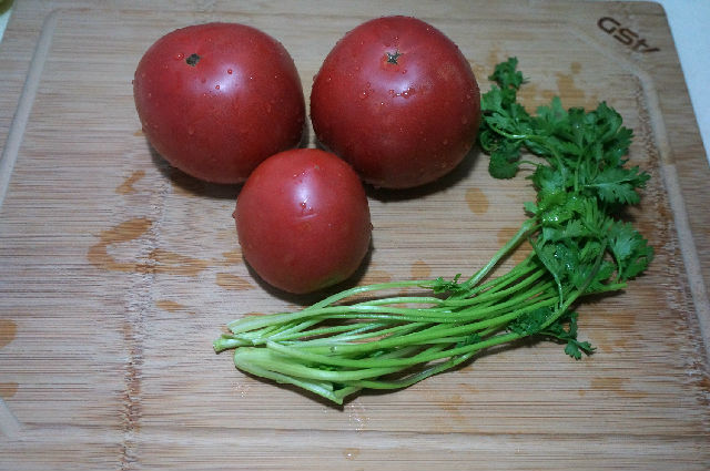 材料:自制面條適量,西紅柿三個(gè),雞蛋三個(gè),香菜兩棵,油適量,蔥花少許,鹽適量,醬油少許