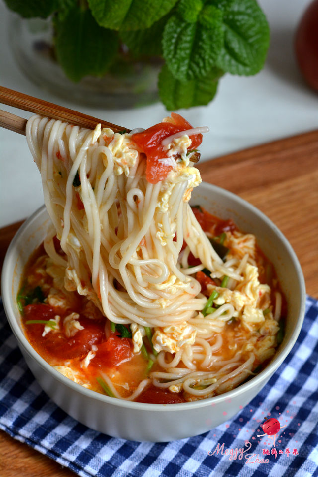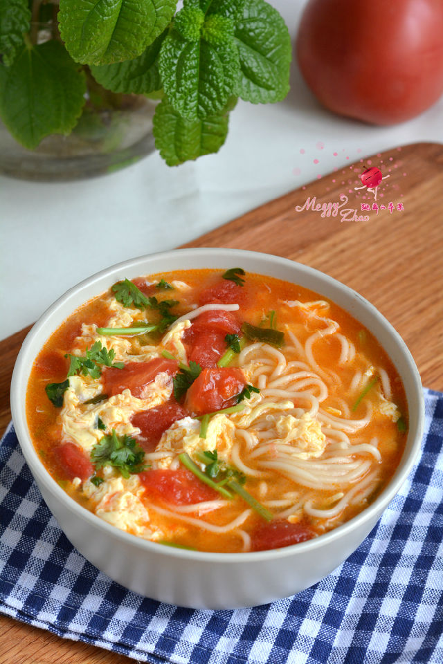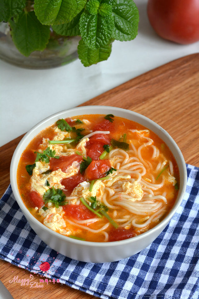 西紅柿熱湯面,酸溜溜的倍兒開胃,出鍋前潑上雞蛋花,撒幾根香菜,紅綠黃白相間,看著就很誘人!