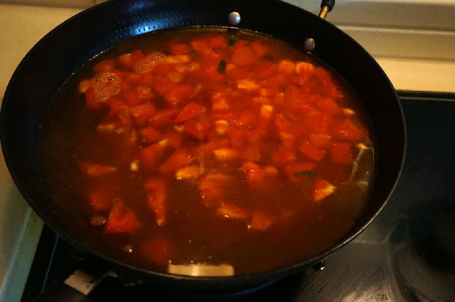 6. 西紅柿倒入鍋中,翻炒變軟;
