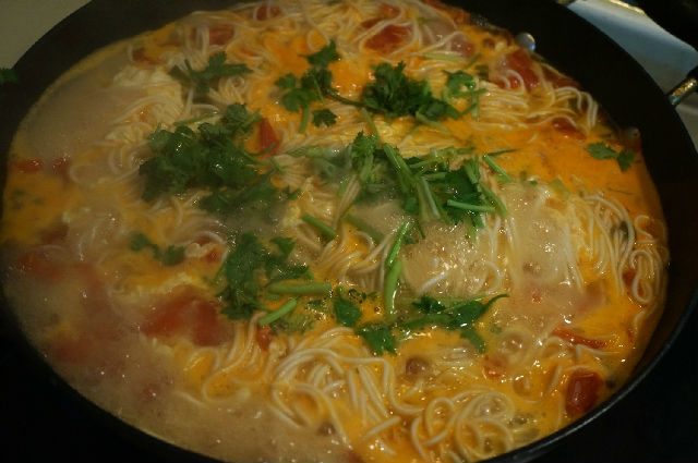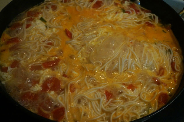 9. 面條煮熟后,將打散的雞蛋液淋入鍋中;