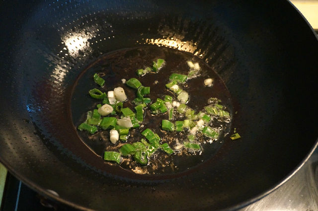 5. 炒鍋中倒少許油,油熱后放蔥花煸炒出香味;