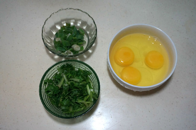 4. 香菜切段,蔥花切碎,雞蛋打入碗中;