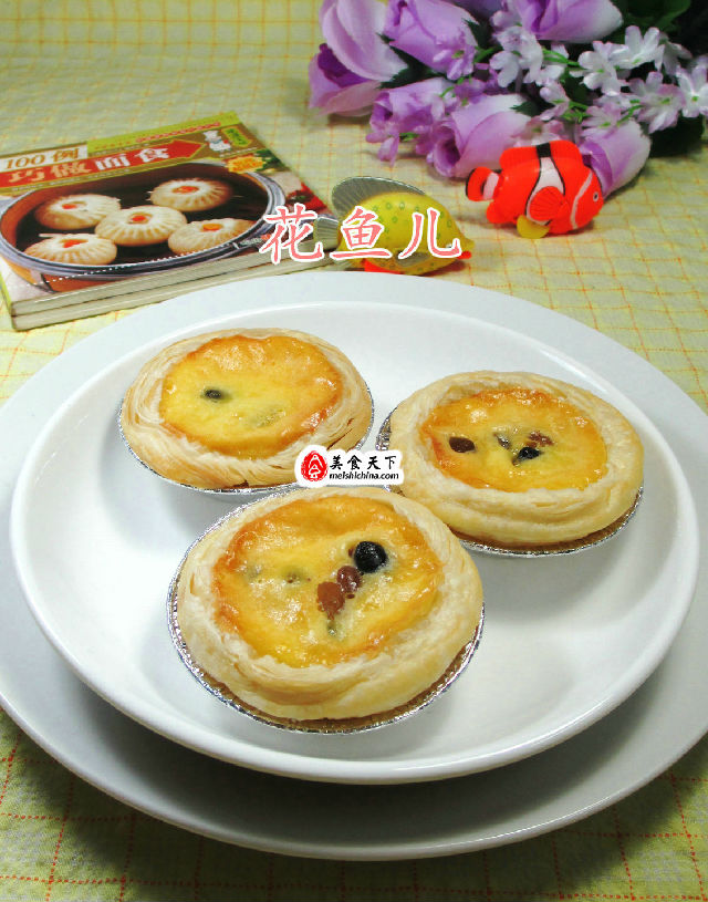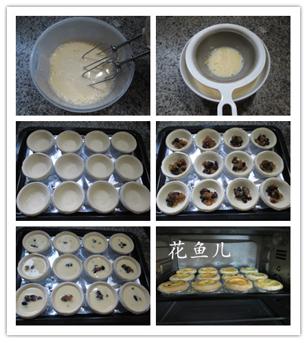 (4)然后,將蛋撻皮置入烤盤中,擱入蜜豆、用勺子舀入牛奶蛋液。