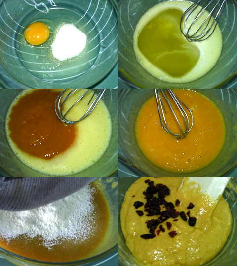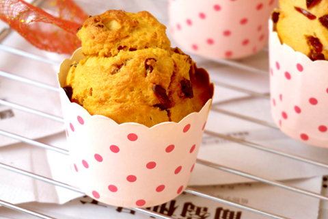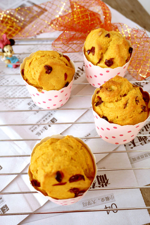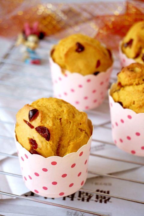 參照了后面的tips,加入了蔓越莓干。如果不加點(diǎn)蔓越莓,這個(gè)正常版的芒果麥芬,看起來就與先前的無油版本沒多大差別。效果還真不錯(cuò),蔓越莓如紅寶石般嵌在金黃的芒果蛋糕上,互相映襯,還真是眼前一亮。。。。。
