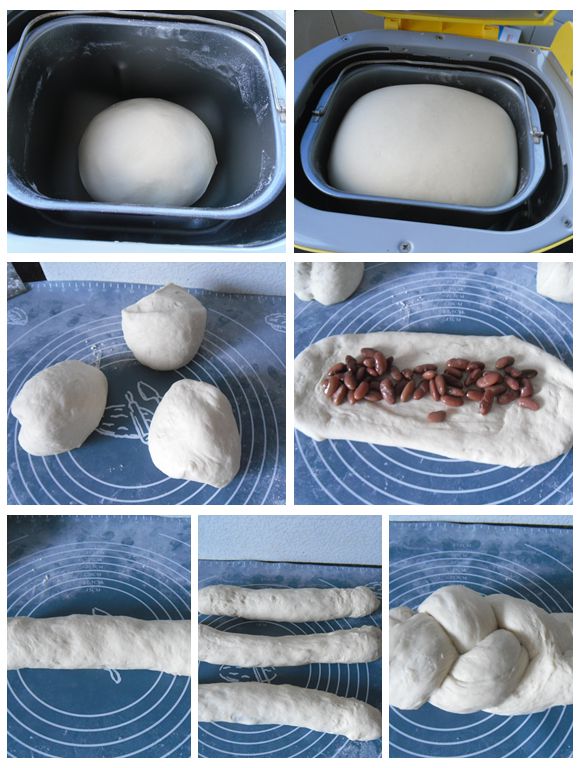 13、把3條交叉編出辮子形狀。14、放入面包桶二次發(fā)酵。