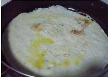 4、煎鍋加熱在鍋里抹一層油,倒入面糊,煎鍋?zhàn)笥覔u晃兩圈,使面糊均勻地?fù)湓阱伬铮@樣,面糊就自然成一張餅的樣子了,用小火,等面糊定形好,(如倒下去的面糊不規(guī)則向四周散開,說明面糊太稠了,在面糊里再加一點(diǎn)水。)