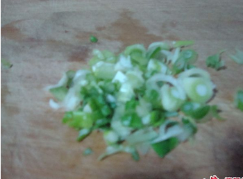 1 雞蛋打破放在大碗里,攪拌準(zhǔn)勻,蔥花切碎,