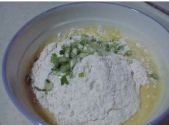 2、蔥花、雞蛋、面粉混合,加入水拌成可流動的糊狀。