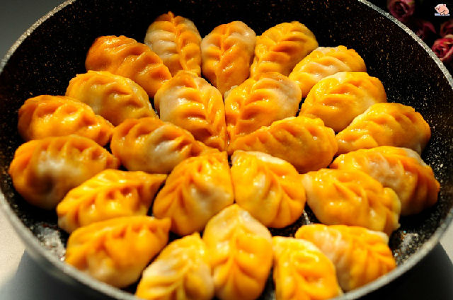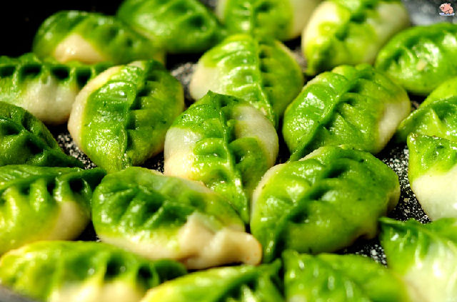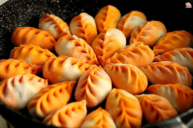 17,平底鍋內(nèi)加入少許底油,把餃子平鋪。