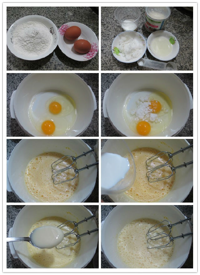 食材:低筋面粉100克、雞蛋2只、牛奶40克、綿白糖40克、植物油10克、無鋁泡打粉2克、煉乳