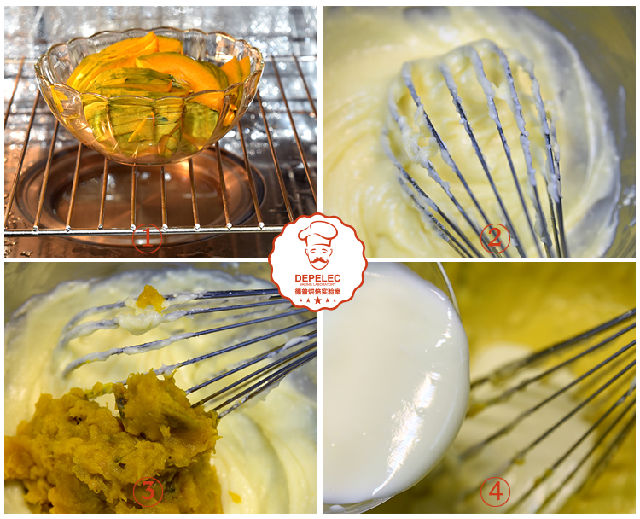 1、南瓜切片,蒸熟,除去多余水份,置涼備用;