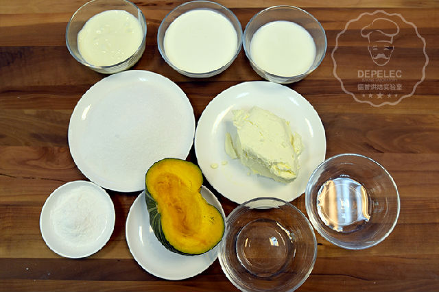 準(zhǔn)備食材:奶油奶酪250g,細(xì)砂糖220g,酸奶150g,南瓜泥180g,牛奶100g,鮮奶油150g,冷水20g,,沸水20g