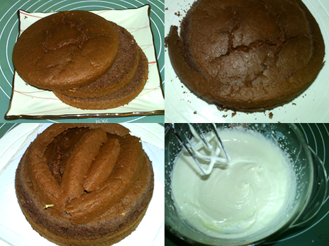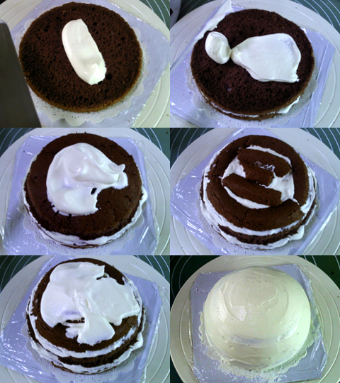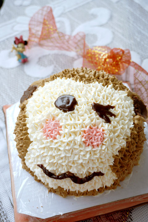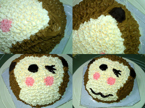 可可戚風(fēng)做坯,可以配合小猴的棕色猴毛。而為了配合可可戚風(fēng)的味道,在打棕色奶油的時候又加了些許可可粉,讓奶油也帶上可可的味道?;蛟S用巧克力醬什么的會更好,不過當(dāng)時沒想起來。