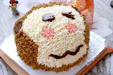 2、用牙簽在表面勾出猴臉輪廓。調(diào)紅色奶油,用尖齒花嘴擠出兩個紅色小圓,成為紅臉蛋。用白色奶油,沿猴臉輪廓擠上一圈。再繼續(xù)將整個臉部填滿。用可可粉與棕色色素調(diào)成棕色奶油,沿擠好的白色面部外側(cè)擠上一圈,再繼續(xù)將所有空白擠滿,
