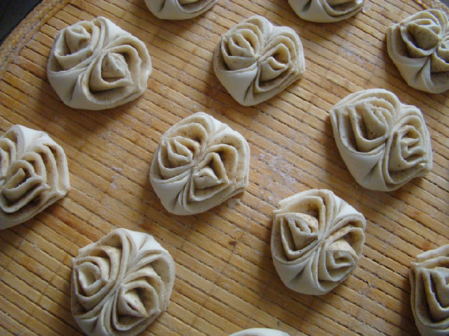 9,把做好的花卷放在竹簾上發(fā)酵至2倍 大。