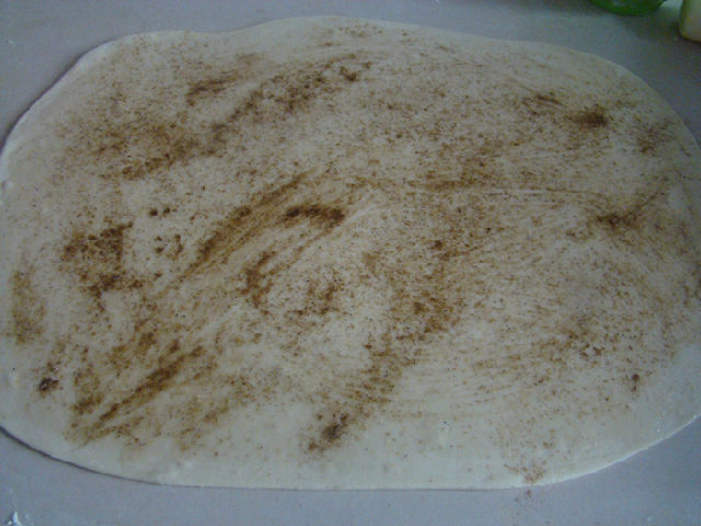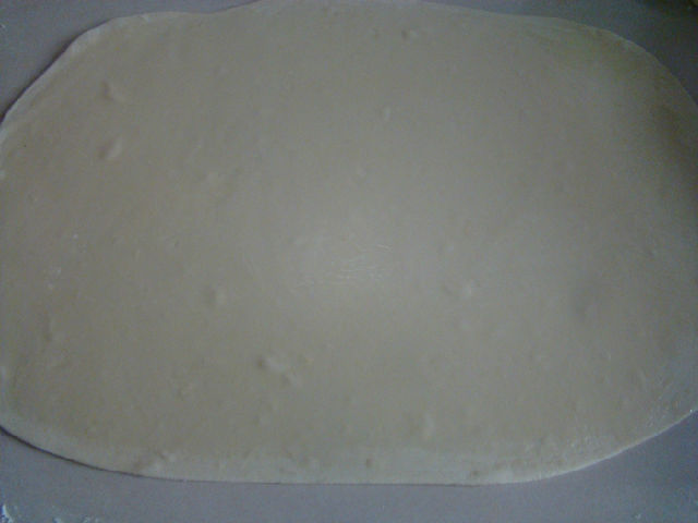 3,將醒好的面團搟成大薄片。刷上一層食用油。