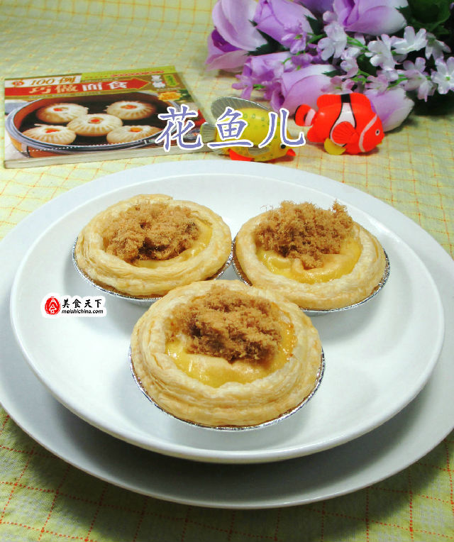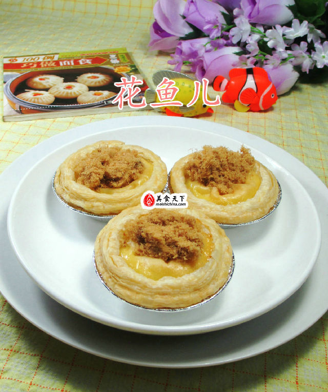 (5)最后,烤箱預(yù)熱,175度烘烤40——45分鐘、取出,擱入的肉松,即成。