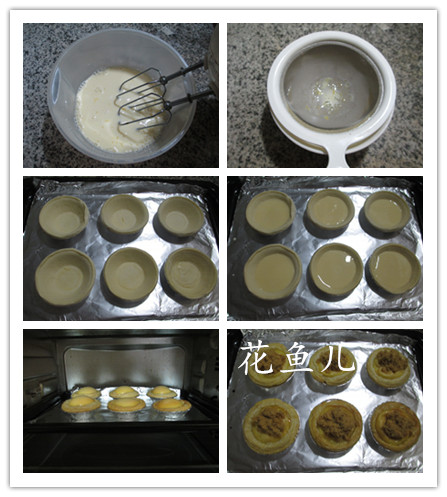 食材:蛋撻皮6個(gè)、肉松30克、雞蛋1只(已打入碗中)、牛奶40克、淡奶油25克、綿白糖20克