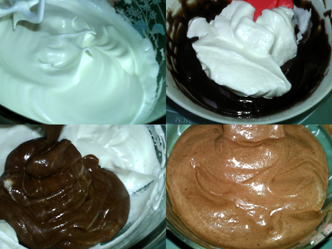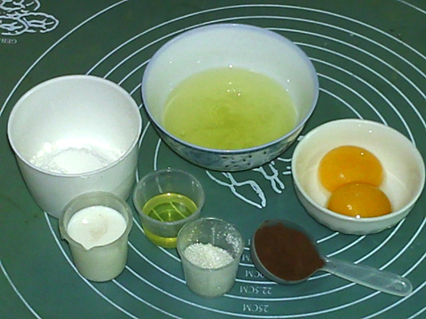 用料:牛奶30克,玉米油12克,可可粉7克,低筋粉31克,蛋黃31克,蛋白75克,細砂糖45克
