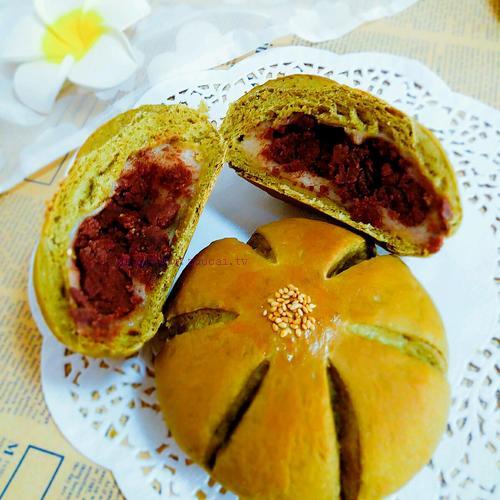 面團(tuán)料:1.高筋面粉(250克) 1.牛奶(125克) 1.鹽(2克) 1.酵母(3克) 1.雞蛋(50克(約一個(gè))) 1.白糖(25克) 1.抹茶粉(10克) 1.黃油(15克) 麻薯料:2.糯米粉(90克) 2.牛奶(160克) 2.黃油(10克) 2.玉米淀粉(25克) 2.糖(35克) 餡料:豆沙(100克) 蔓越莓干(若干)