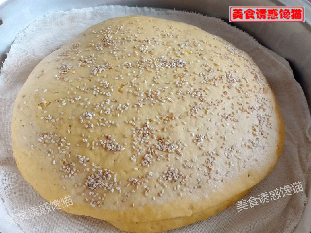 10、在面餅表面輕輕刷些水,撒上芝麻,涼水入鍋,大火將水燒開,中火蒸30分鐘,關(guān)火,燜3-5分鐘后再揭開鍋蓋。