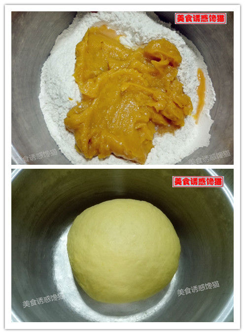 2、面粉與酵母粉混合,加入南瓜泥,邊加邊揉成光滑的面團(tuán)。