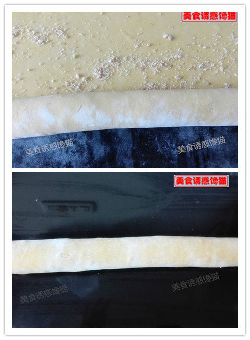 5、將發(fā)酵好的面團(tuán)搟成一張大面片,刷一層油,撒一層面粉,將油與面粉刷勻,撒一層花生蓉。