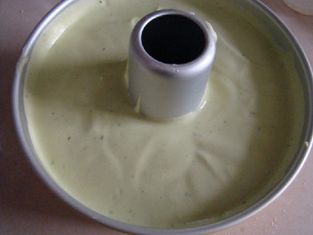 6,再與剩下的蛋白糊翻拌均勻倒入烤模內(nèi),震出氣泡。
