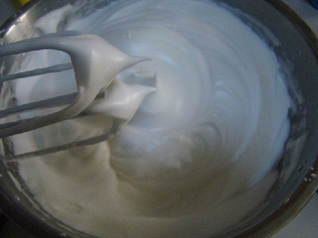 4,蛋白分離到無(wú)水無(wú)油容器內(nèi),用打蛋器攪打呈粗泡狀,加入檸檬汁,并分3次加入60克的細(xì)砂糖,以快速方法攪打后蛋白淡漸呈發(fā)泡狀態(tài),攪打的同時(shí)明顯出現(xiàn)紋路狀,最后提起打蛋頭,蛋白能拉起一個(gè)短小直立的尖角。