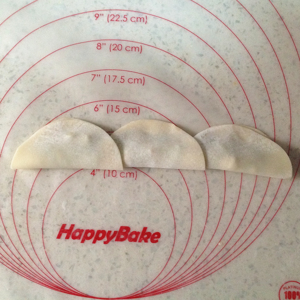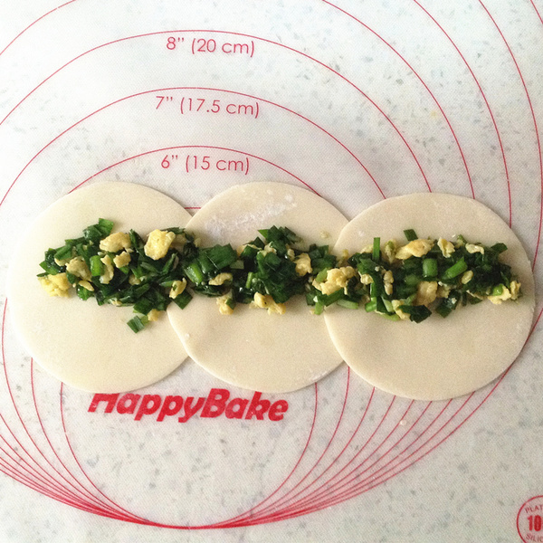 4、把三張餃子皮錯(cuò)開疊放,放上合適餡料。