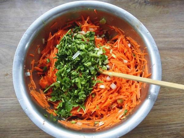 胡蘿卜 三四個 面粉 100克 香菜 2顆 雞蛋 兩個 蔥 一顆 姜 適量 油 15克 鹽 一勺 雞精 一勺 五香粉 一勺 雞汁 一勺