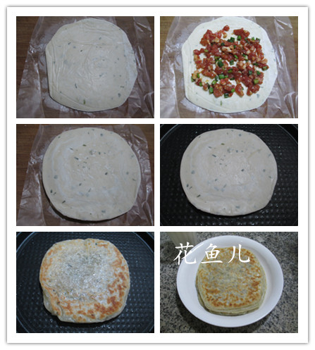 (4)然后,將做好的肉餡飛餅擱入電餅鐺中煎至兩面金黃,即成。