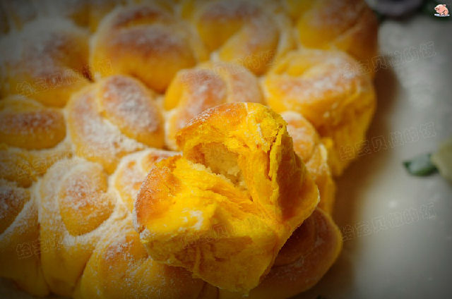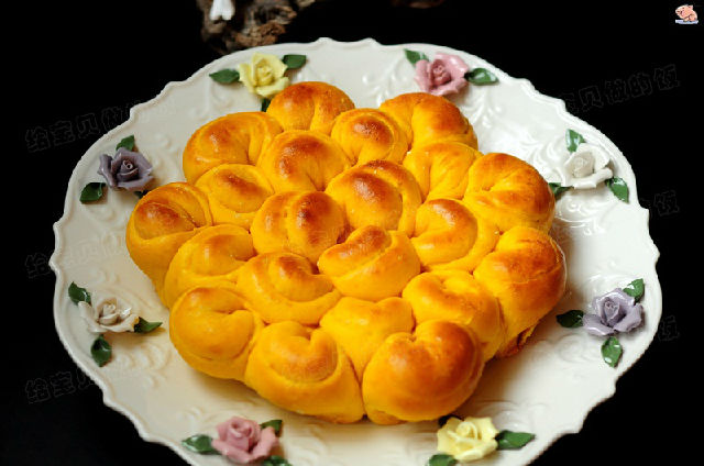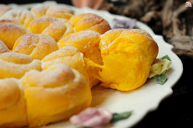 用南瓜做成的菊花椰蓉面包,不但養(yǎng)眼,營養(yǎng)也很豐富。南瓜含有豐富的胡蘿卜素和 維生素C,可以健脾,預(yù)防 胃炎,防治 夜盲癥,護(hù)肝,使皮膚變得細(xì)嫩,并有中和 致癌物質(zhì)的作用。黃色果蔬還富含兩種維生素A和D;維生素A能保護(hù)胃腸黏膜,防止胃炎、胃潰瘍等疾患發(fā)生;維生素D有促進(jìn)鈣、磷兩種礦物元素吸收的作用,進(jìn)而收到壯骨強(qiáng)筋之功,對于兒童佝僂病、青少年近視、中老年 骨質(zhì)疏松癥等常見病有一定預(yù)防之效。