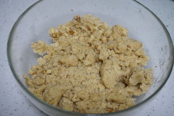 5、篩入面粉后倒入核桃碎,看不到干粉就行,不用揉的太細(xì)。