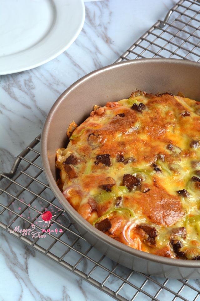 3. 鋪兩層馬蘇里拉奶酪,可以形成很好的拉絲效果,熱吃時(shí)拉絲效果明顯,涼后就沒(méi)有了;