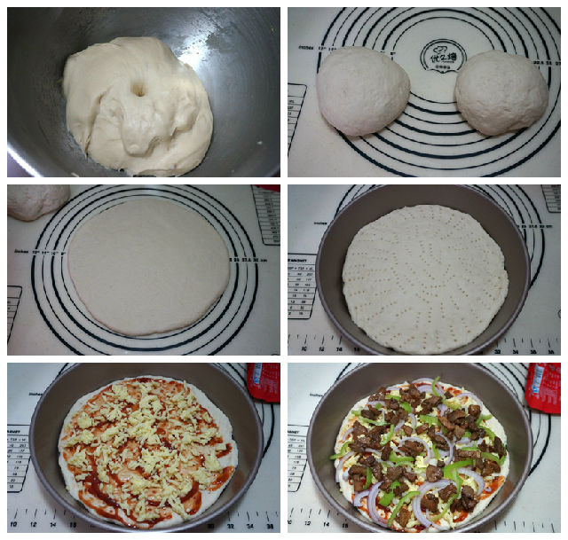 4. 烤第一張披薩餅時(shí),完成第二張餅的搟制、鋪撒,最好準(zhǔn)備兩個(gè)披薩盤(pán),如果披薩盤(pán)不夠,用烤箱自帶的方烤盤(pán)也可以噢;