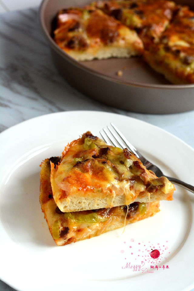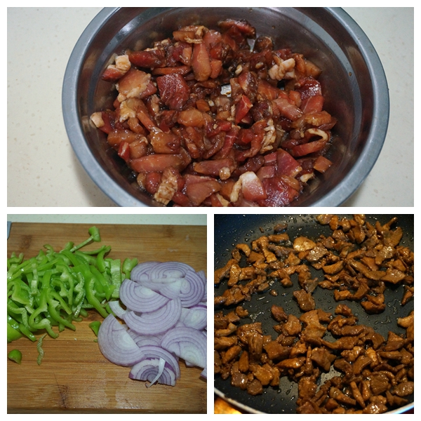 8. 腌好的咸肉上平底鍋中炒熟,這樣便于入味,而且烤出的披薩不會(huì)水塌塌的;
