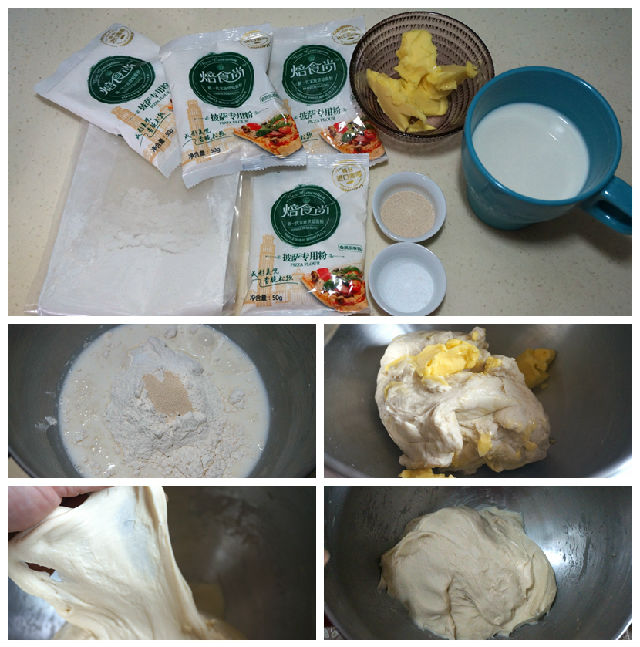 面餅材料:高筋面粉340克,牛奶230克,酵母3.5克,鹽3克,黃油30克