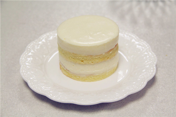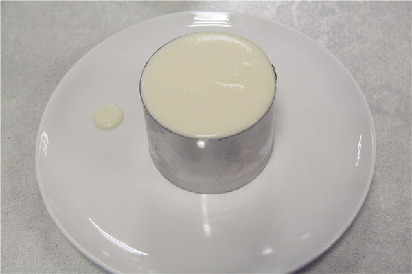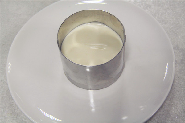 5、然后模具底部先放一片蛋糕片,再倒入適量淡奶油