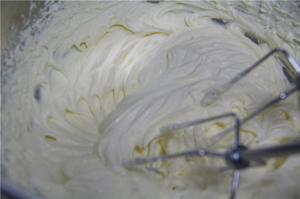 3、將橙汁跟打發(fā)好的奶油混合攪勻