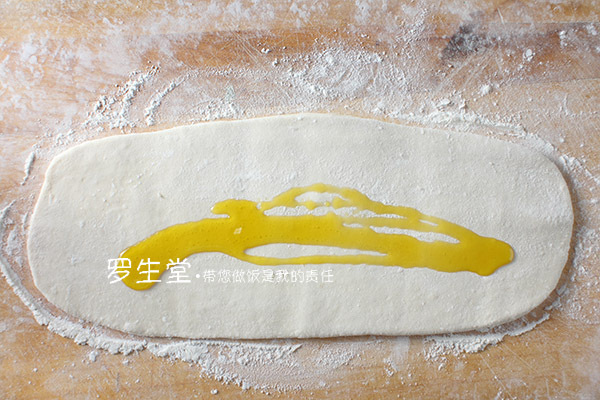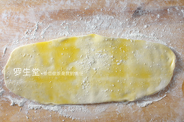 3、把油在面皮上抹勻,撒適量鹽,均勻的撒少許面粉,這樣可以出更好的層