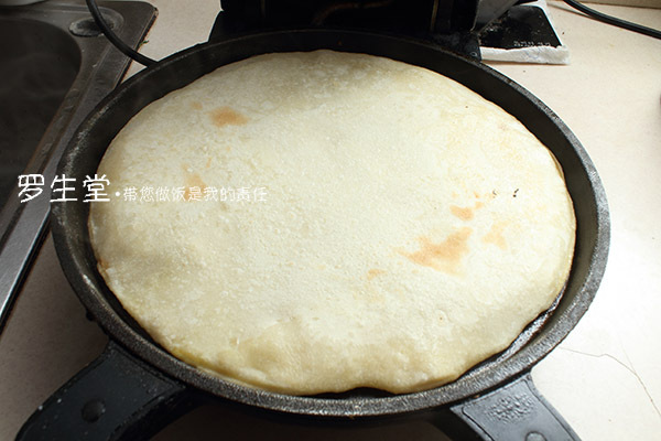 7、電餅鐺提前燒熱,刷少許油,把面放進(jìn)去蓋上約三四分鐘后會(huì)看到餅會(huì)鼓起,說明層次還不錯(cuò)