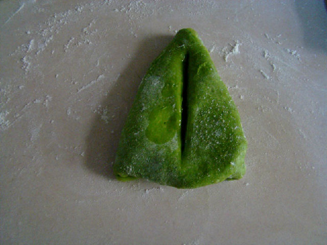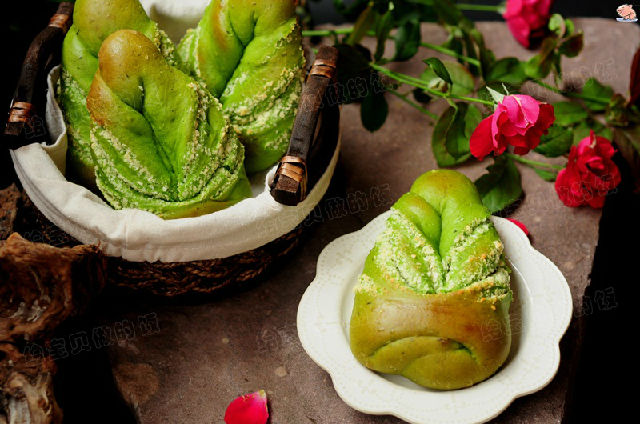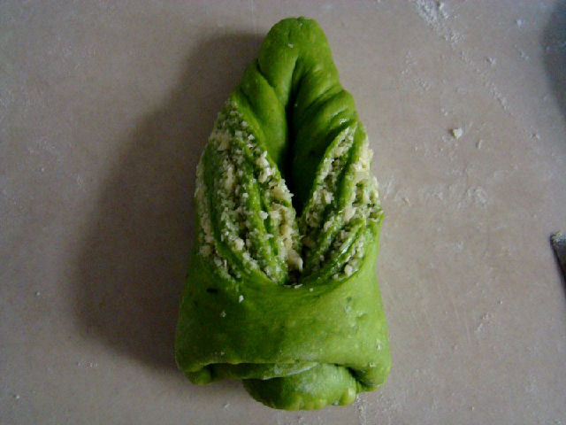 面團(tuán)原料:高粉200克,細(xì)砂糖35克,鹽1/4小匙,蛋液35克,酵母粉3克,菠菜汁100克,黃油15克