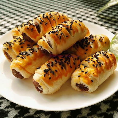 17.按照這個(gè)手法做好全部豆沙卷,表面刷上蛋黃液