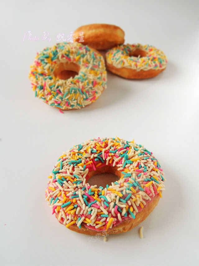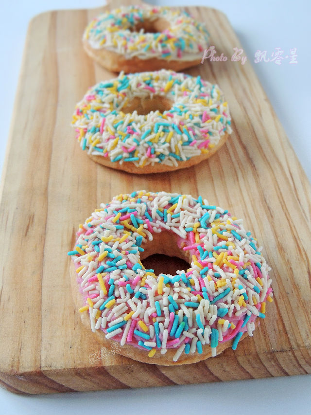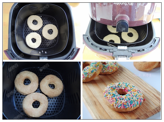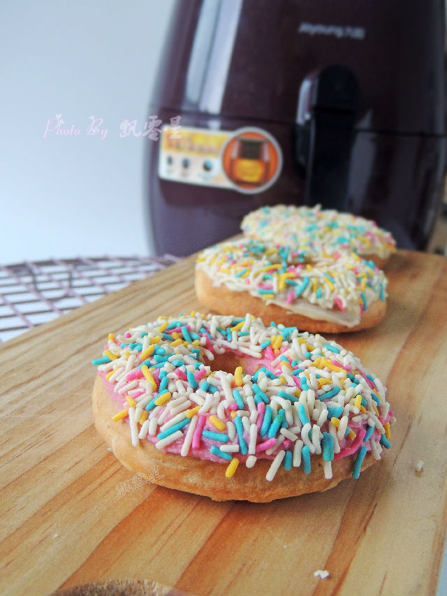 13.中途可以拉開炸籃查看,炸好的甜甜圈完全冷卻以后,粘上融化的巧克力,撒上彩色糖針裝飾,就可以吃了