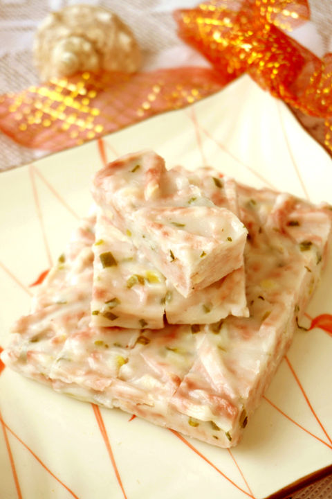 倒入抹油的模具中,鋪平。放入沸水鍋中,大火蒸20-30分鐘。熟透,出鍋。冷卻后切塊。