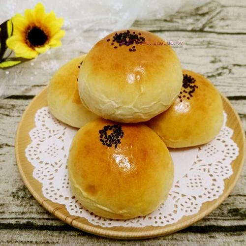 16.將面團(tuán)排氣,按壓成餅狀,包入豆沙,封口,攏成圓形