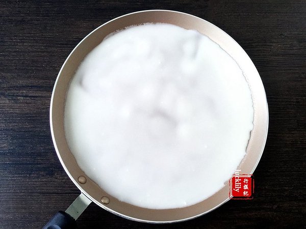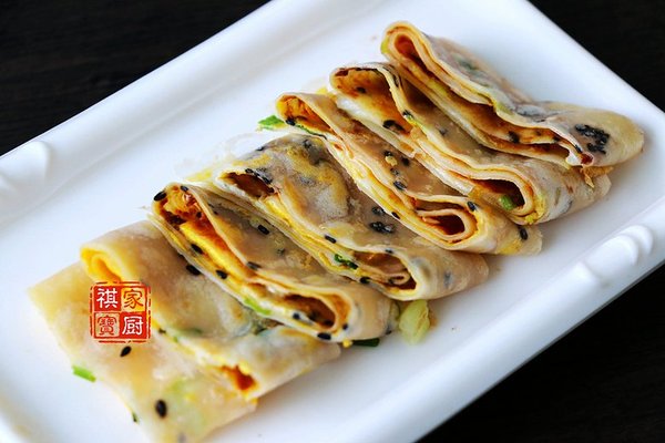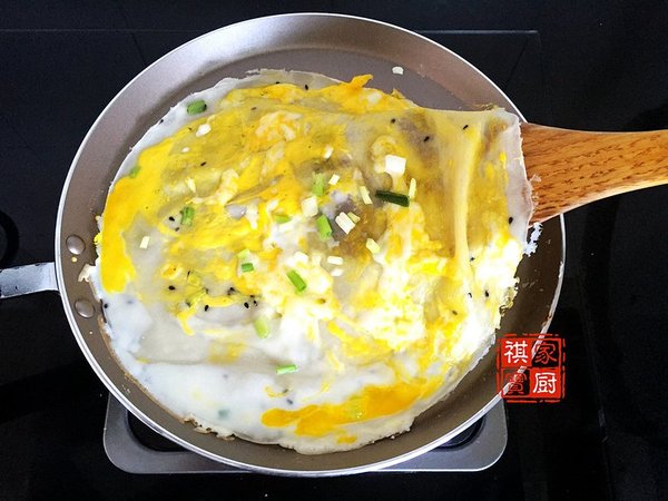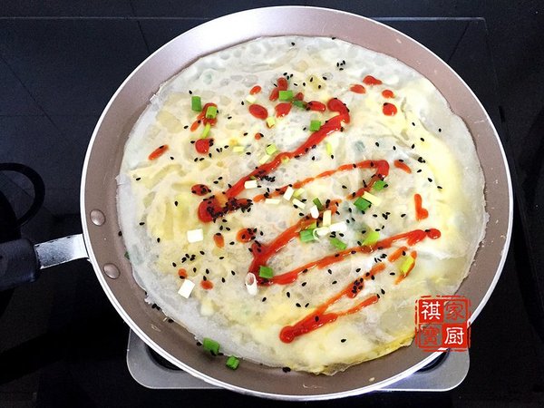 鍋底抹上一層極薄橄欖油,微微加熱后倒入面粉糊,轉(zhuǎn)動(dòng)不粘鍋,使面糊均勻鋪開(kāi);
